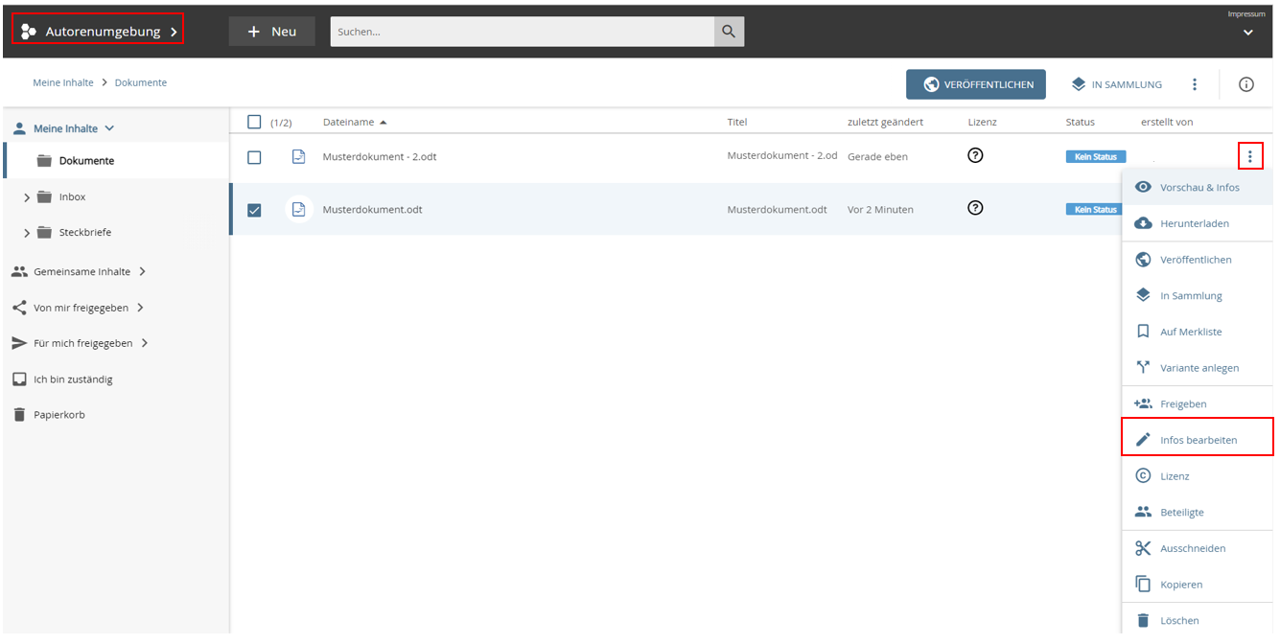 Um die Metadaten Ihres Materials zu ändern, rufen Sie den Metadatendialog Ihres Materials auf. Gehen Sie in Ihre Autorenumgebung und öffnen Sie die Menüoptionen (⋮) des Materials, das Sie gern anpassen möchten. Wählen Sie hier „Infos bearbeiten“ aus.