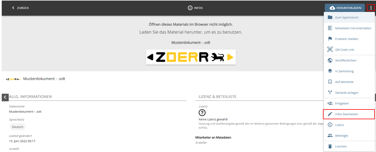 Alternativ können Sie den Metadatendialog aufrufen, indem Sie Ihr Material öffnen und das Menü oben rechts (⋮) aufrufen. Auch hier finden Sie den Punkt „Infos bearbeiten“, über den Sie in den Metadatendialog gelangen.