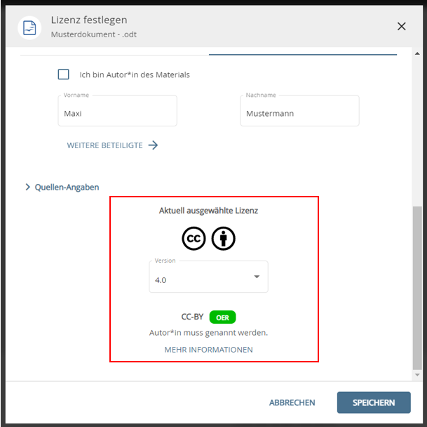 Nachdem Sie Ihre Lizenzangabe gespeichert haben, wird sie in der Beschreibung Ihrer Materialien sichtbar. Weitere Informationen zu den Creative Commons Lizenzen finden Sie im ZOERR in der FAQ Lizenz.