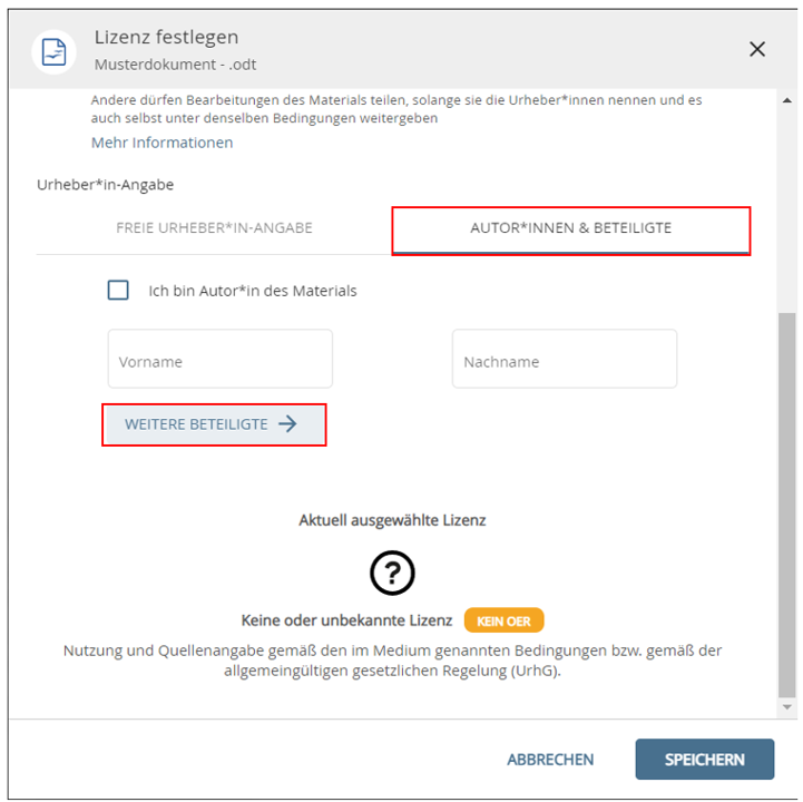 Die „Freie Urheber-Angabe“ wählen Sie bitte nur, wenn keine Personen als Urheber benannt werden können. Hier können Sie bspw. Institutionen oder Firmen als Urheber benennen. Sie können die Urheberangabe jederzeit ändern: Öffnen Sie hierfür in Ihrer Autorenumgebung das gewünschte Bildungsmaterial und wählen Sie die Option „Beteiligte“ im Menü (⋮) aus.