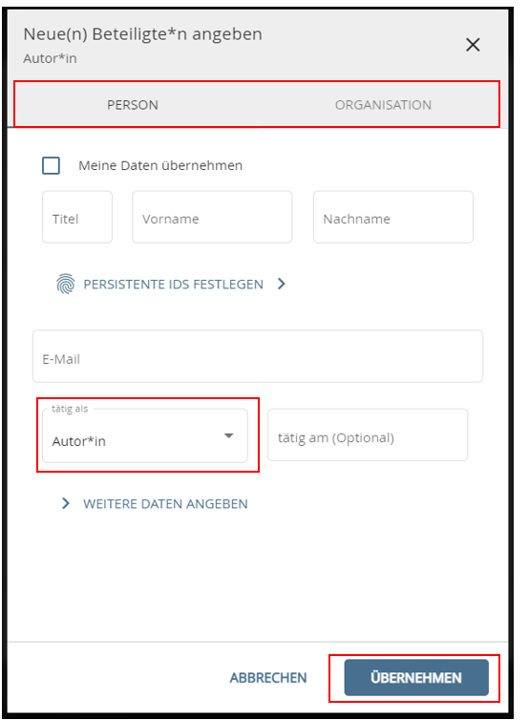 Im folgenden Fenster haben Sie die Möglichkeit, alle Urheber, beteiligten Personen und/oder Organisationen sowie deren Rolle zu benennen. Tragen Sie einen Namen in die Eingabemaske ein und wählen Sie anschließend im Feld „tätig als“ die passende Funktion bspw. Grafiker aus. Sie haben die Wahl zwischen 14 verschiedenen Rollen. Speichern Sie Ihre Eingabe mit dem Button „Übernehmen“. Um weitere Beteiligte hinzuzufügen, wiederholen Sie die vorangegangenen Schritte.