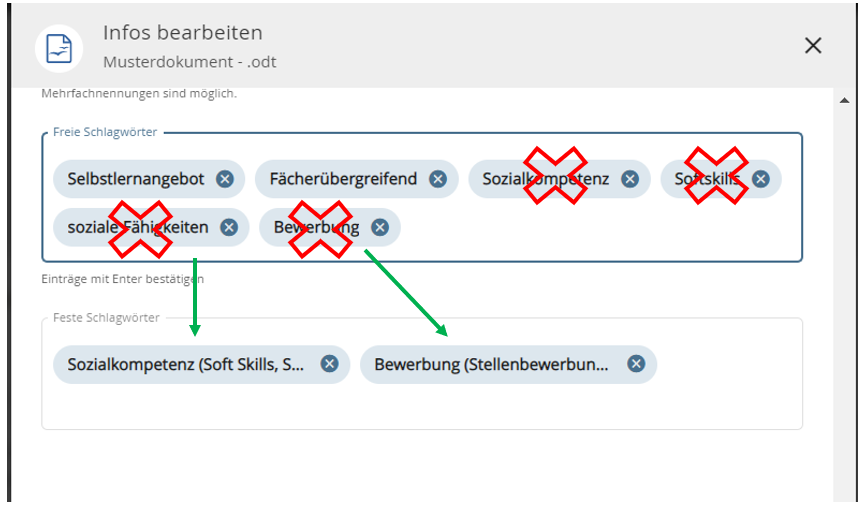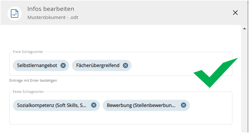 Alles was Sie nicht im Titel unterbringen können, können Sie als Schlagwort anbringen. Denn auch darüber lässt sich die Auffindbarkeit der Materialien erhöhen. Hier ein paar Tipps zur Vergabe von Schlagworten: