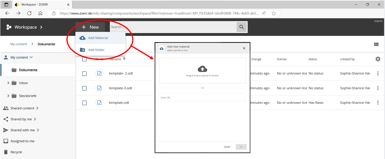 On the top left you can choose the environment. Click there ("Search") and select the Workspace. There you have your private area under "My content". You can create folder structures as you wish and upload materials or refer to OER elsewhere via web link ("New" button).