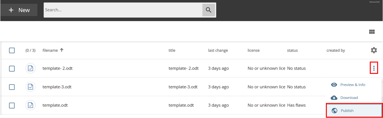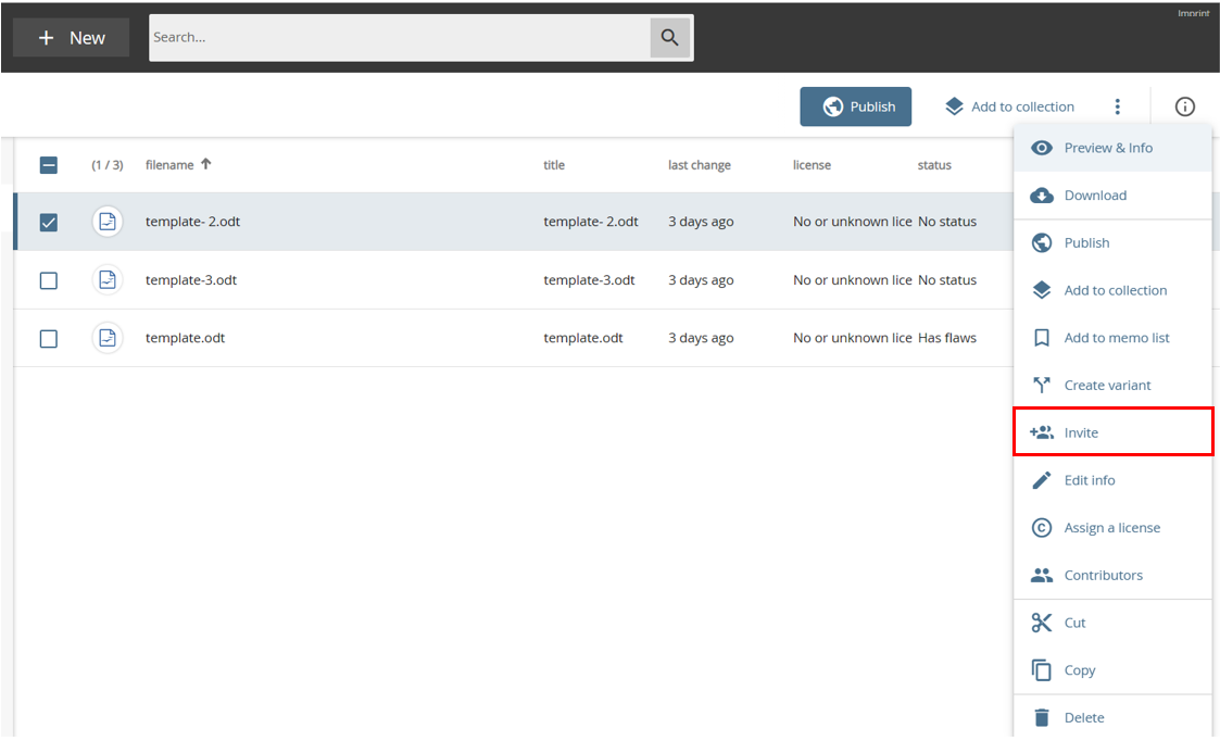 For later editing of the metadata, you can call up the dialog at any time via the 3-point menu on the right under "Edit info", the license dialog under "Assign a license".