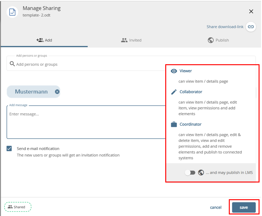 For each invited person, you have the choice to share the material with them as "Viewer",
