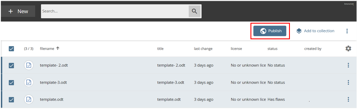 You can also mark several objects from a folder with ticks and submit them for publication at the same time with the "Publish" button in the bar at the top.