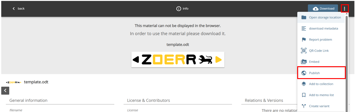 Do you want to publish several OERs that belong together or build on each other? Then you can add this under the 3-dot menu under "Manage relations" als ‘is based on’, ‘is part of’ and ‘references’.Once the OERs have been published, they can also be bundled into a collection. In this case, please contact the ZOERR editorial team. Further information on this can also be found in FAQ question 9: I would like to organise my OER in a collection.