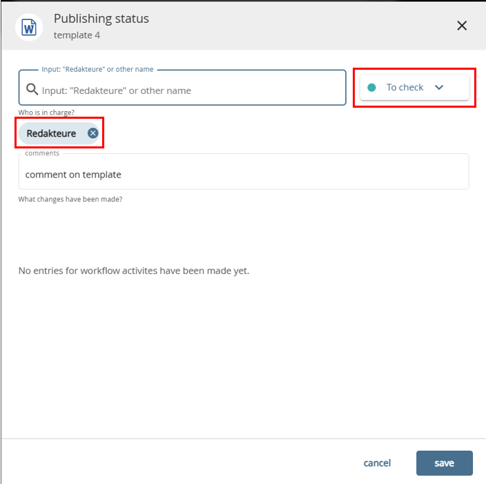 If it is a matter of re-publishing or re-delegating to the editors after editing, please also call up "Publish" (but only for a single object). Now please enter the group "editors" in the field "user/editorial group" (simply type the first few letters to find the "editors"). Then select the status "To check" at the top right and write a short comment.