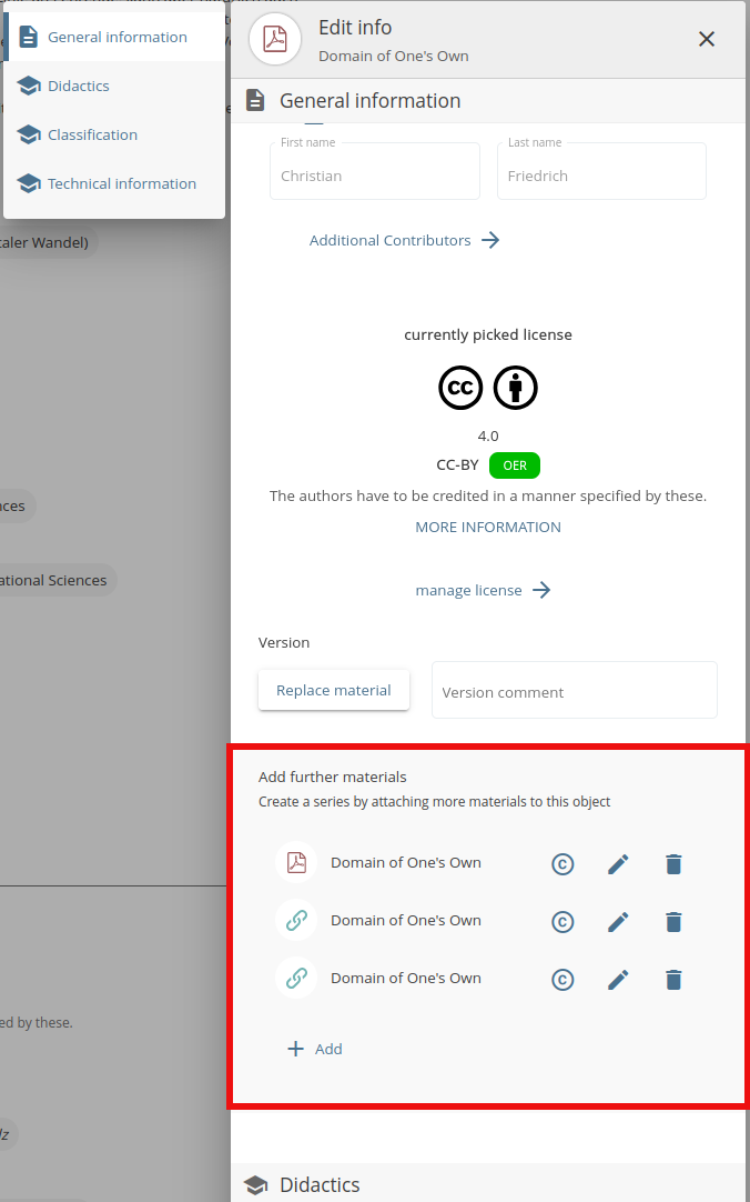 If you want to publish several materials that belong together, e.g. the worksheet and its solution, you can add further files or web links under "Add further materials". We recommend our authors to ideally provide several file formats of a material (e.g. for a text document not only the PDF, but also the .docx file and an open file format such as .odt.The materials added in this way form a series together with the main object and initially have the same metadata. However, the title, licence and author of the series elements can be adapted individually if required. Further information on this can be found in our FAQ under question 4: How can I bundle multiple files or links into one OER?